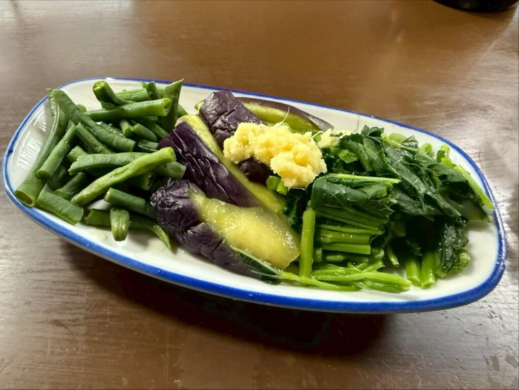 インゲン、ナス、モロヘイヤ。季節を感じる夏野菜3兄弟。これはうれしい。