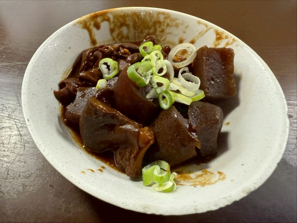豚の小腸とガツ、こんにゃくが煮込まれた、皿で出てくるタイプのどて。