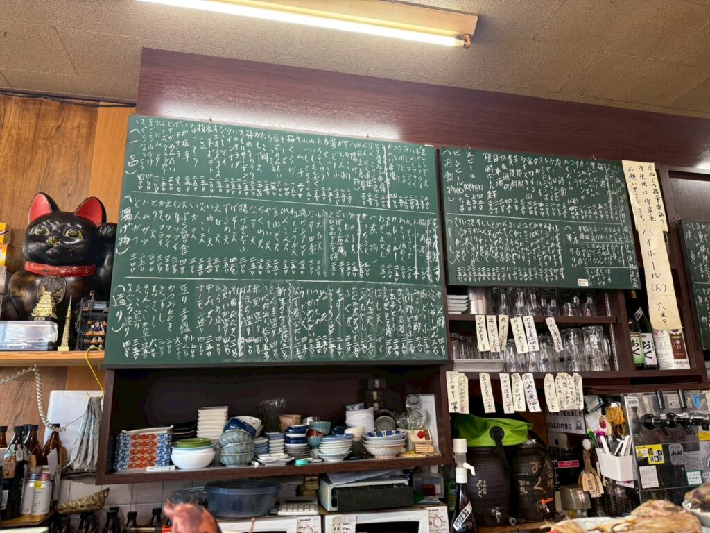 気持ちいいフォントに小さめのポイント数、魚介中心に200以上はありそうな”お品書き”が黒板いっぱいに書き込まれている。