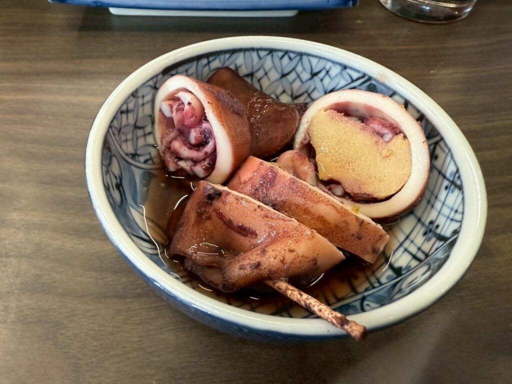 甘く炊かれた真イカのお腹の中には高野豆腐、エンペラー部分にはゲソが詰まった贅沢すぎる一皿。