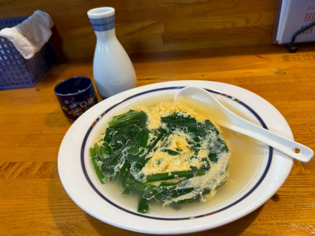 熱燗を頼んで厨房を眺めていると、中華鍋を振る音と、アクロバティックに舞う豚キムチにしばし見惚れてしまう。豚キムチに惹かれつつも、お腹と相談し、日本酒にも合いそうなニラ玉子とじでファイナルアンサー。