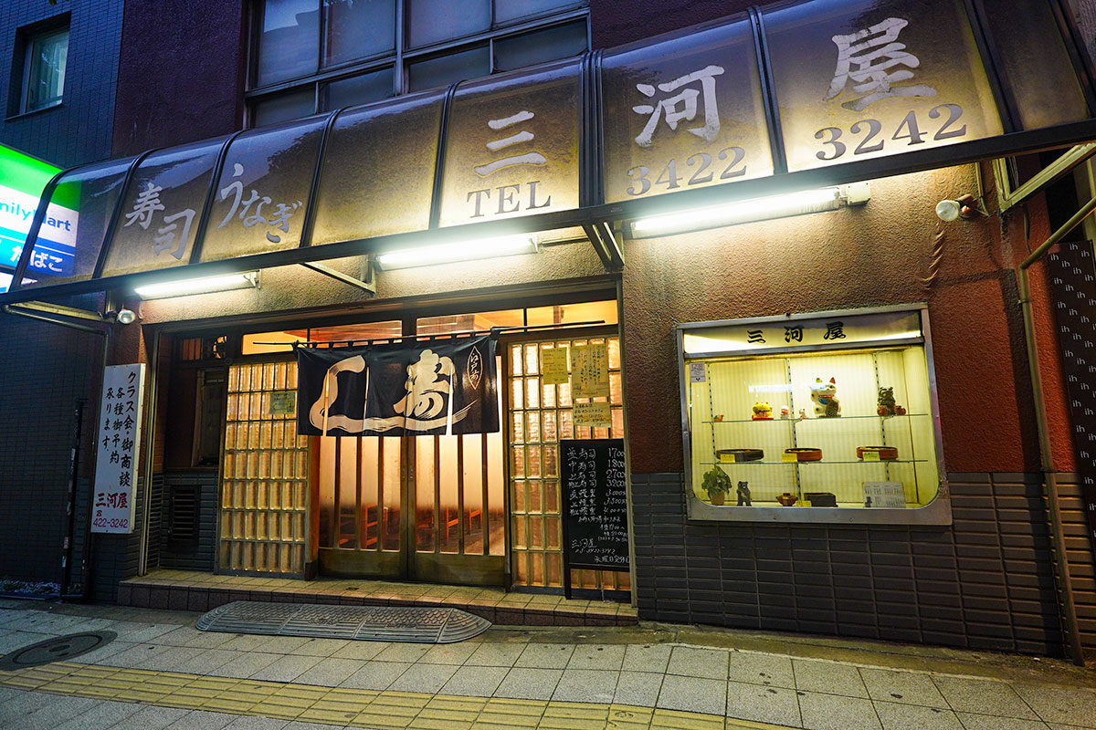三軒茶屋の国道246号線沿いに、いつも路線バスから眺めては気になっていた一軒があります。寿司と鰻の文字を掲げる『三河屋』。創業1964年、最初の東京オリンピック