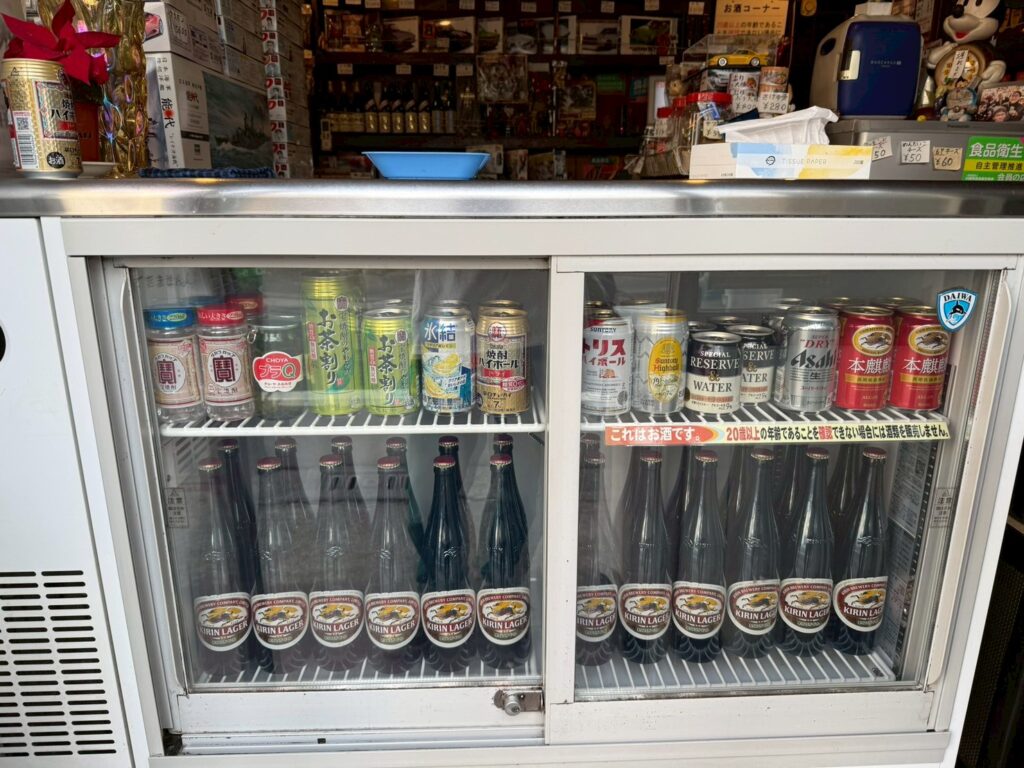 ドリンクは、下段にキリンラガーの大瓶がずらり。上段には、呑兵衛御用達の宝焼酎ハイボールなど、厳選された缶が並ぶ。