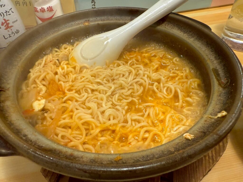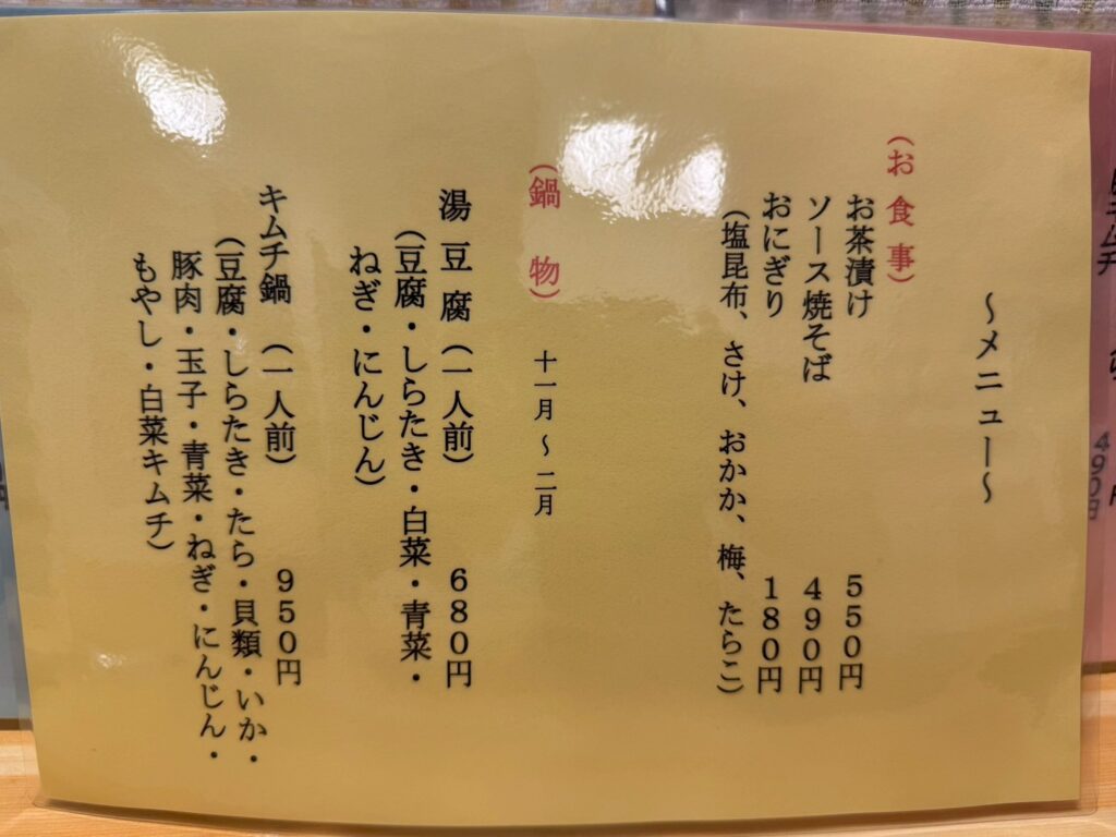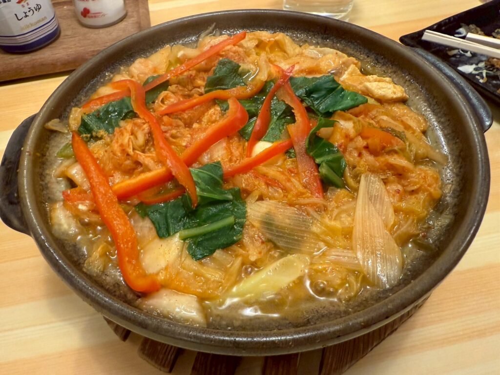 鍋は湯豆腐とキムチ鍋の2択。ここは漁師町。具材で判断し、たら、イカ、貝類が豪勢に入ったキムチ鍋をもらうことに。