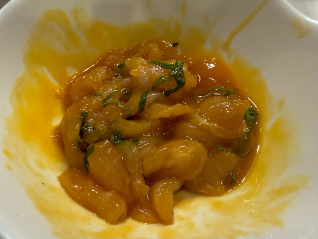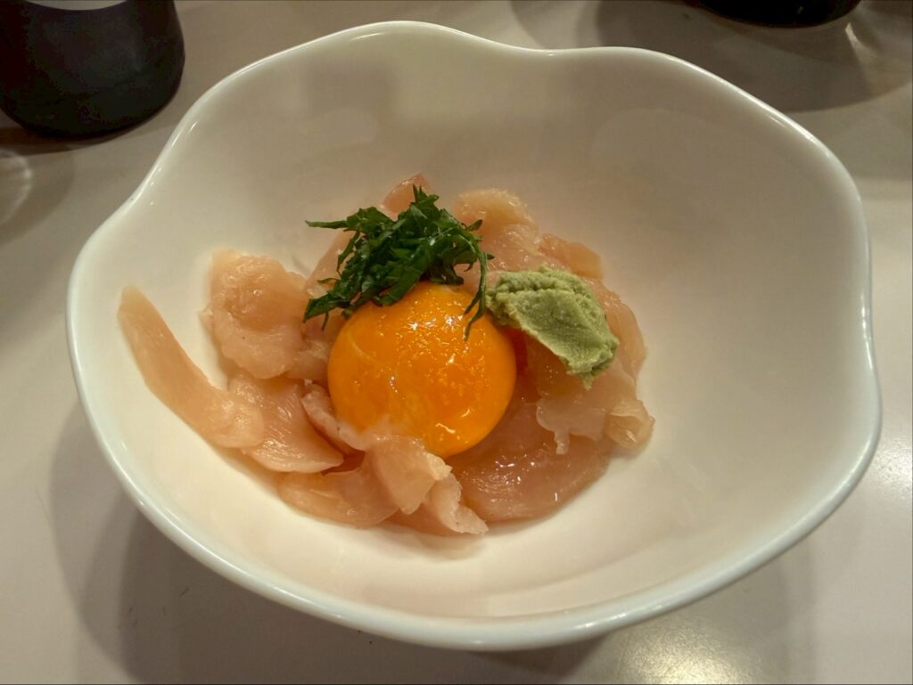 ササミに卵黄と大葉、そこに醤油を加え、ねちゃねちゃに混ぜ合わせる。マッチョマンも喜ぶ、マッスル美味い一品だ。