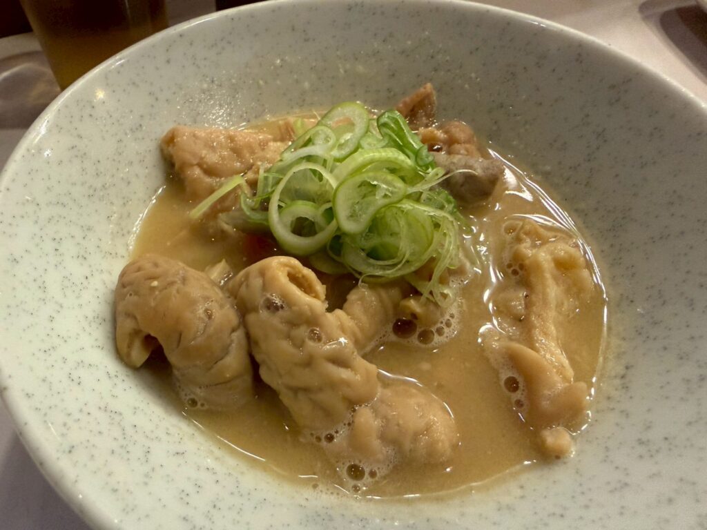 茶碗で登場、テッポーと根菜のシンプルな豚モツ煮込み。