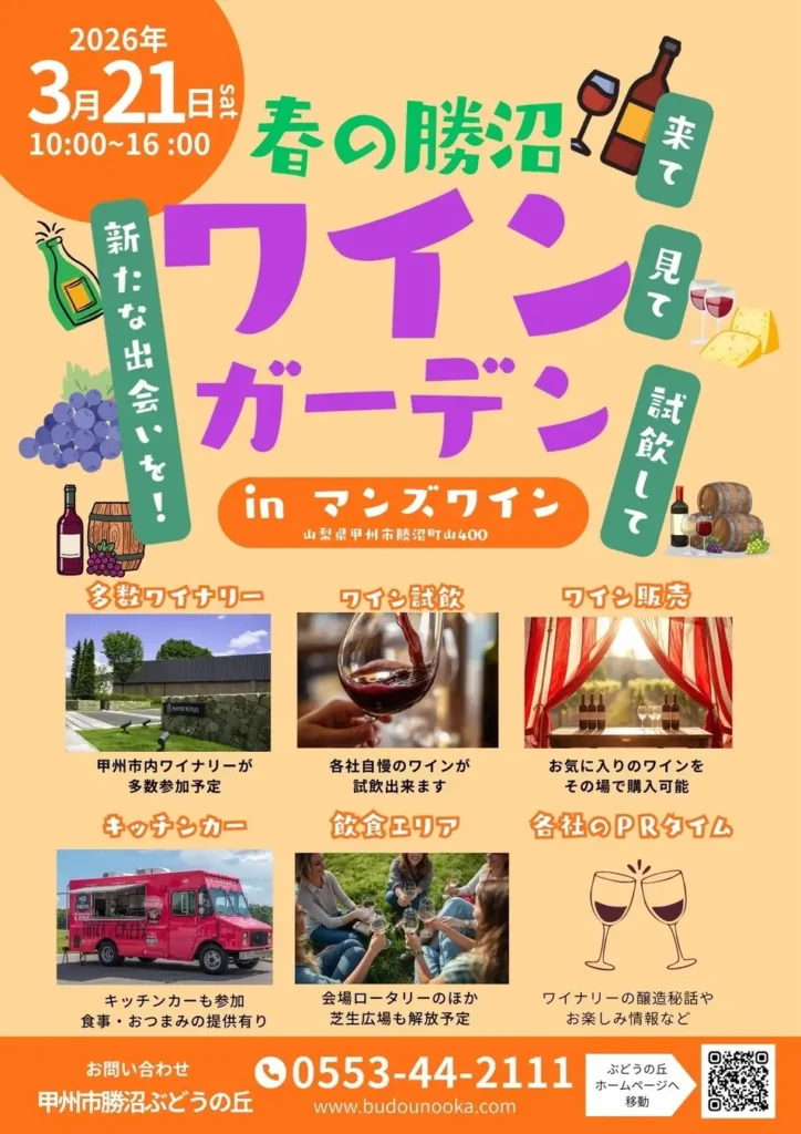 山梨県甲州市のワイナリーが集結する試飲・販売イベント「春の勝沼ワインガーデン」が、2026年3月21日(土)にマンズワイン勝沼ワイナリー(山梨県甲州市)で開催される。