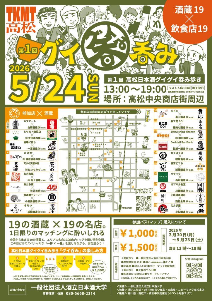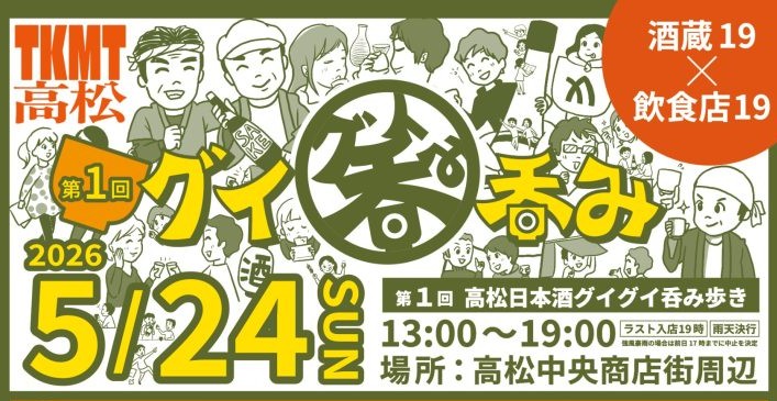 2026年5月24日、高松中央商店街周辺で「第1回 日本酒グイグイ呑み歩き」が開催される。香川県内外から19の酒蔵が集結し、地元飲食店19店とコラボ。参加者は専用パスを購入し、各店で日本酒約60mlと料理のペアリングを楽しみながら街を巡るスタイルだ。