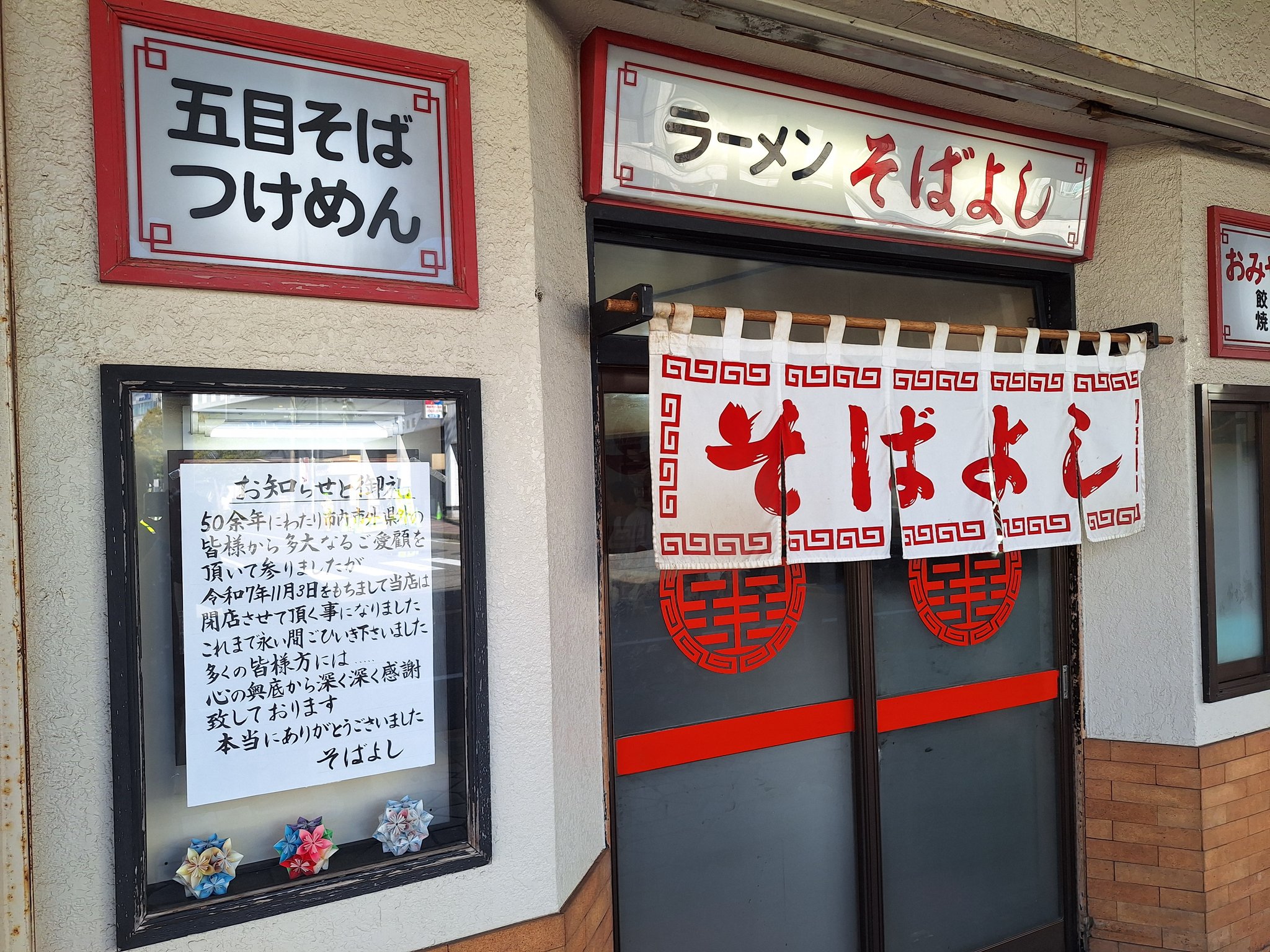 【閉店】柏崎の老舗ラーメン店「そばよし」が半世紀の歴史に幕stopping businessTwitterFacebookはてブPocketLINEコピー 2025.10.04柏崎「そばよし」新潟県柏崎駅近くにある、創業52年の老舗ラーメン店「そばよし」さんが11月3日(月・祝)に閉店します。長い間お疲れ様でした。新潟県柏崎市の柏崎駅近くの人気ラーメン店そばよしが今年11月3日で閉店。50余年の老舗が歴史に幕。評判のいいお店だったので非常に残念。個人の飲食店がどんどん閉店してく# Ramen pic.twitter.com/21JVPSDHOV— metabolisan (@metabolisan) October 3, 2025X@santa_corgiMAPラーメンそばよし〒945-0055 新潟県柏崎市駅前2丁目1−70