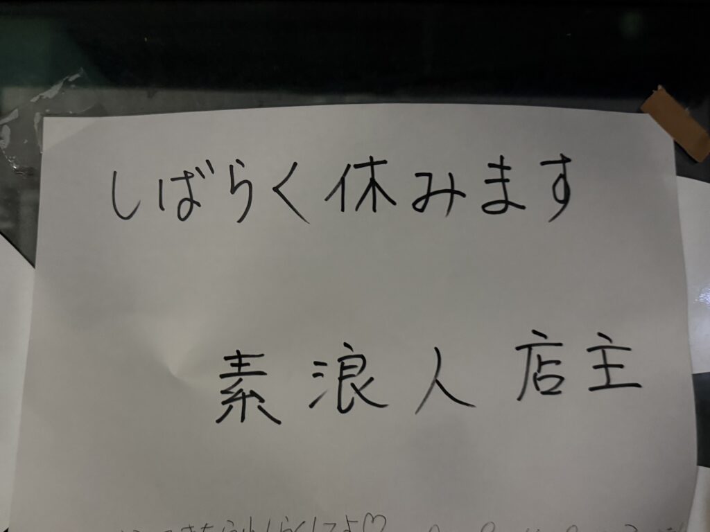 【休業】武蔵境のディープ酒場「素浪人」が休業holidayTwitterFacebookはてブPocketLINEコピー 2026.01.14Table of Contents武蔵境「素浪人」MAP武蔵境「素浪人」ご高齢の大将とICUのアルバイトさんで回す武蔵境の人気居酒屋「素浪人」さん。昨年秋頃から大将の体調不良により休業しています。今はこちらの貼紙もなくなっているので心配ですね。MAP素浪人〒180-0023 東京都武蔵野市境南町2丁目1−20