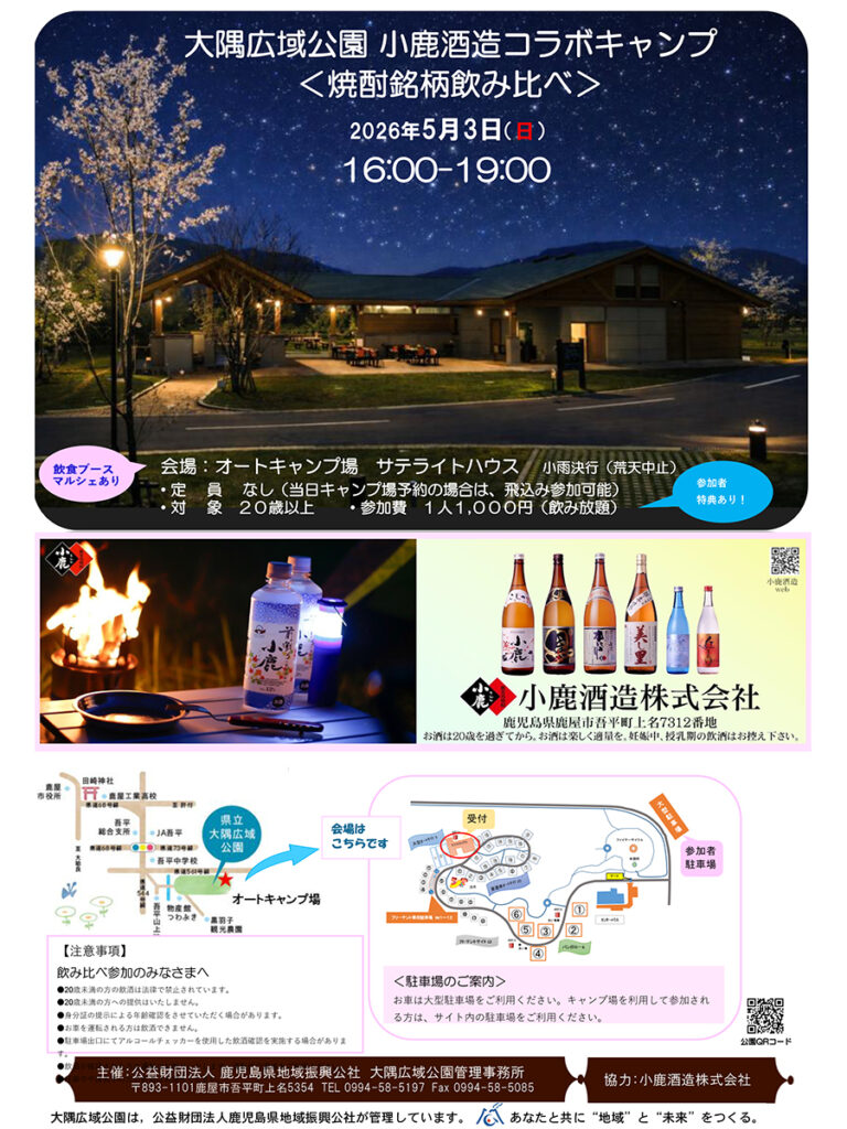 鹿児島の小鹿酒造は、大隅広域公園とコラボした焼酎飲み比べイベントを5月3日に開催する。会場は同公園オートキャンプ場で、16時から19時まで実施。参加費1,000円で焼酎飲み放題となり、飲食ブースも出店する。宿泊は事前予約制だが、飲み放題のみの参加も可能。