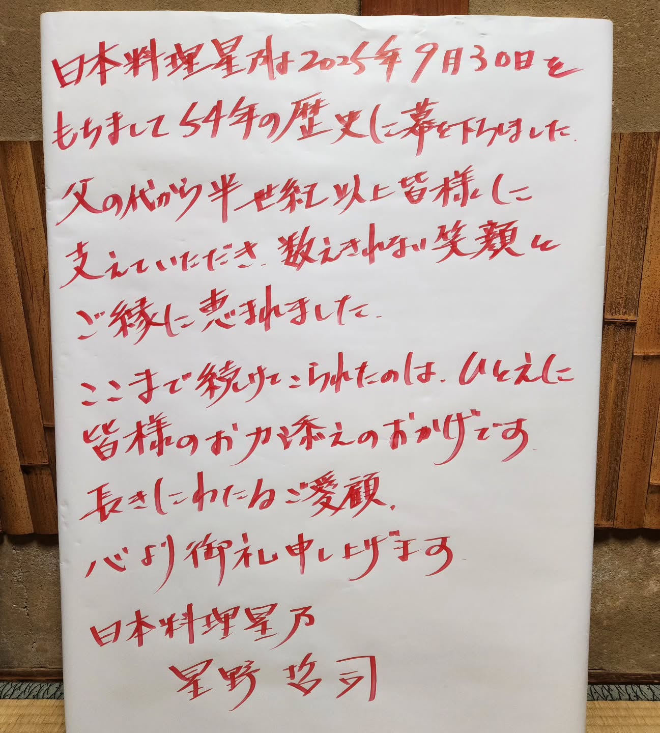 四ツ木にある「日本料理 星乃」さんが、道路拡張工事による立ち退きのため、9月30日(火)に54年の歴史に幕を下ろしました。半世紀上の長きにわたる営業、お疲れ様でした。