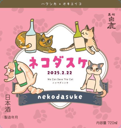 「白鹿」より、数量限定商品『黒松白鹿 ネコダスケ 特別純米 山田錦』が2025年2月7日に発売されます。本商品は2月22日の「猫の日」を記念した特別純米酒で、人気イラストレーター・オキエイコ氏が野良猫の殺処分ゼロへの想いを込めて描いた限定オリジナルラベルを採用しています。
