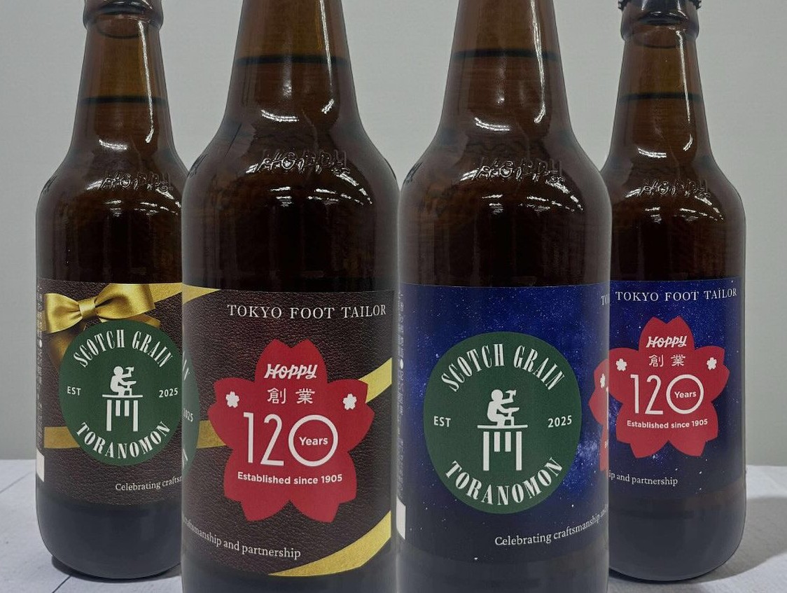 革靴ブランド「スコッチグレイン」とホッピービバレッジによる期間限定コラボが、TOKYO FOOT TAILOR 虎ノ門ヒルズ店で開催中だ。どちらも“同じサラリーマンの味方”として親しまれるブランドであり、熟練職人が一足ずつ仕上げるスコッチグレインのクラフトマンシップに、同社の姿勢へ共鳴したホッピーが今回の企画を実現した。特別に制作された「SG×HOPPY」ダブルロゴ入り限定ホッピーは、来店者先着200名にプレゼントされる。