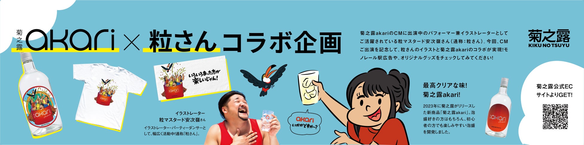 菊之露akariのCMにも出演中の、イラストレーター・パーティーダンサーとして幅広く活動されている粒マスタード安次嶺さん。通称「粒さん」。今回、CM出演を記念して、粒さんのイラストと菊之露akariのコラボが実現!菊之露akariのイメージキャラクター「あかりちゃん」をはじめ、粒さんの楽しげなイラストが、商品コンセプト「いろいろあった方が楽しいじゃん!」の世界を表現しています。イラストは、コラボグッズをはじめ、モノレール内やモノレール駅でもご覧いただけます。コラボグッズは、菊之露公式ECサイトから購入も可能です。また、オリジナルコラボTシャツは、キャンペーンでも抽選で30名の方に当たります!