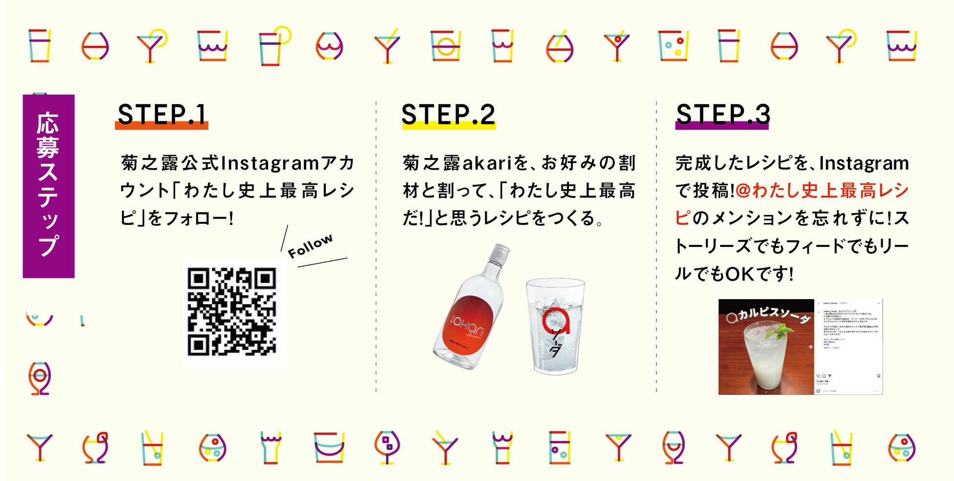 キャンペーン実施に伴い、菊之露akariのミニボトルをサンプルとして配布します。ミニボトルをもらって、気軽にレシピを作り、投稿してみましょう!