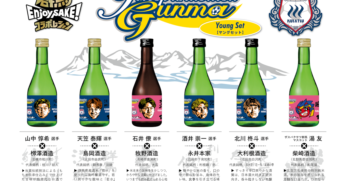 サッカーJ2のザスパクサツ群馬選手の顔がラベルになった地酒セットを発売。30代の5選手とエンブレムのラベルを使用した「ミドルセット」と、20代の5選手とマスコットのラベルを使用した「ヤングセット」のセットは2種類。いずれも300mlの地酒6本セットで価格は4500円(税別)。どちらも230セットを用意しており、県内の酒店で注文を受け付けている。