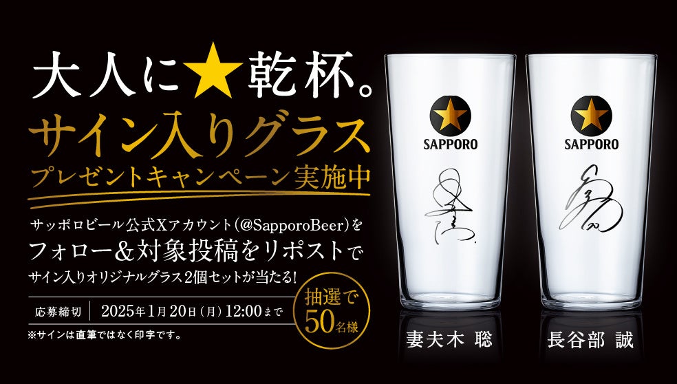 キャンペーン期間中にサッポロビール公式Xアカウント(@SapporoBeer)から投稿されるキャンペーン投稿をフォロー&リポストすると、抽選で50名様に妻夫木聡さん、長谷部誠さんお二人のサイン入りオリジナルグラスセットが当たります。